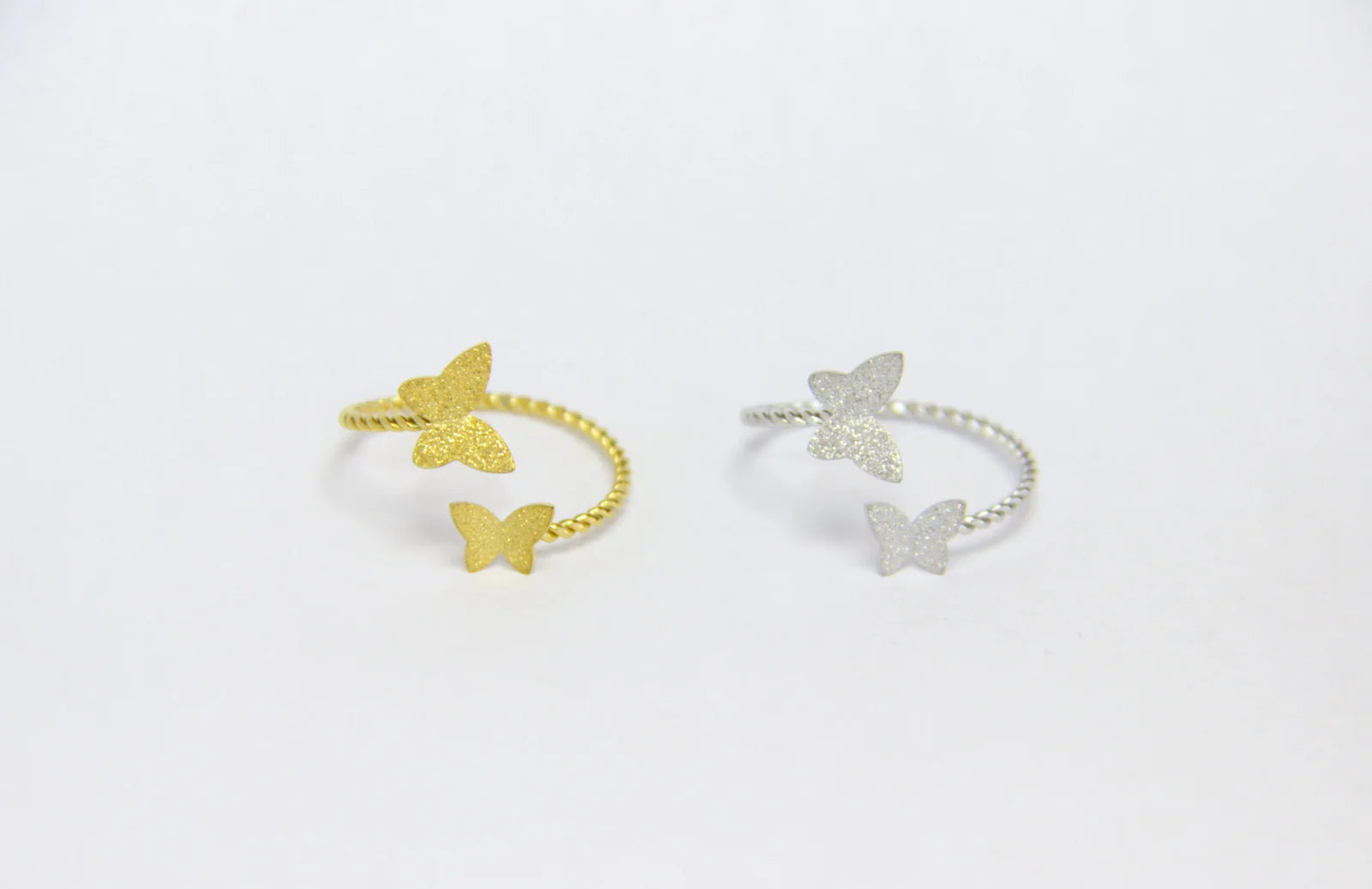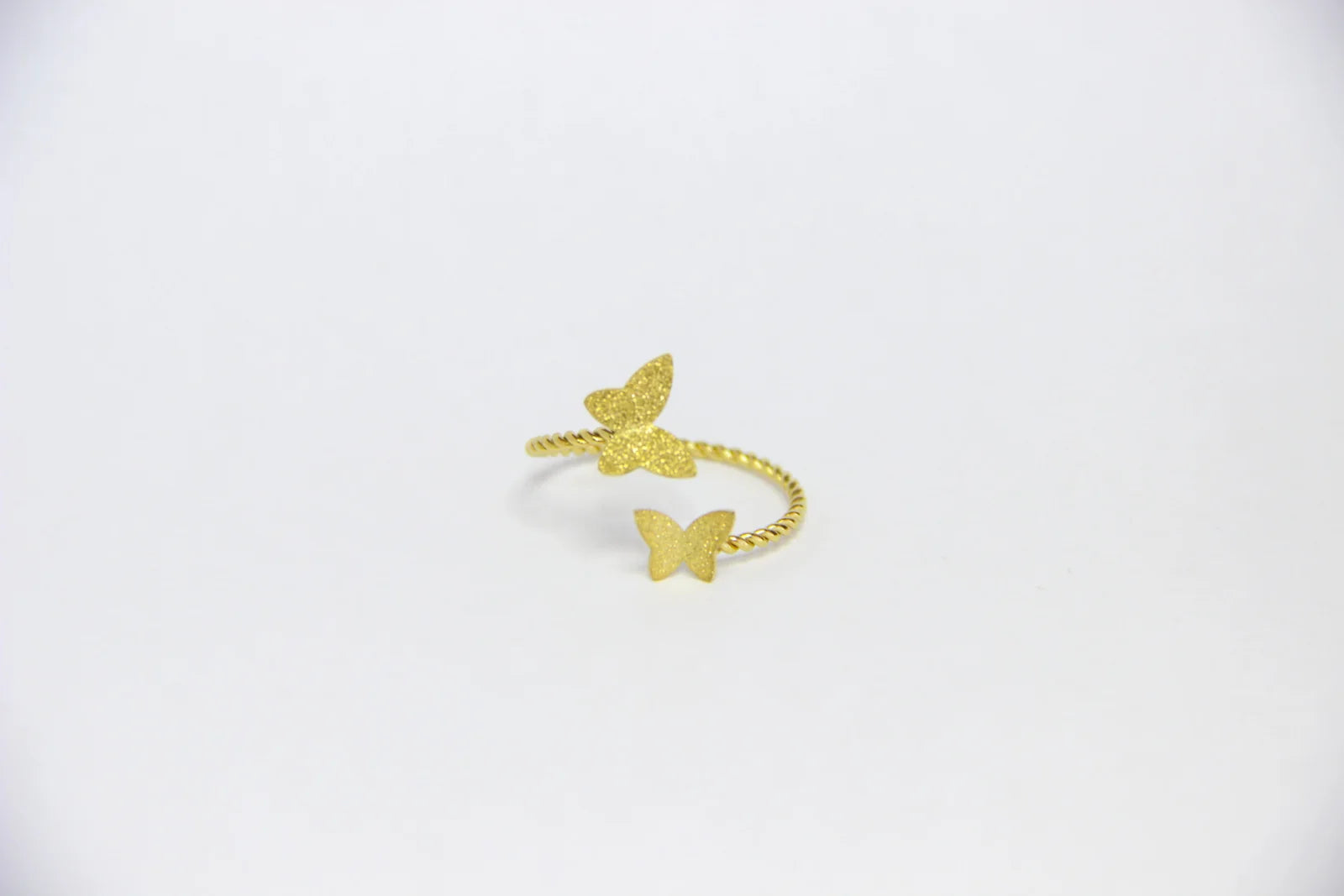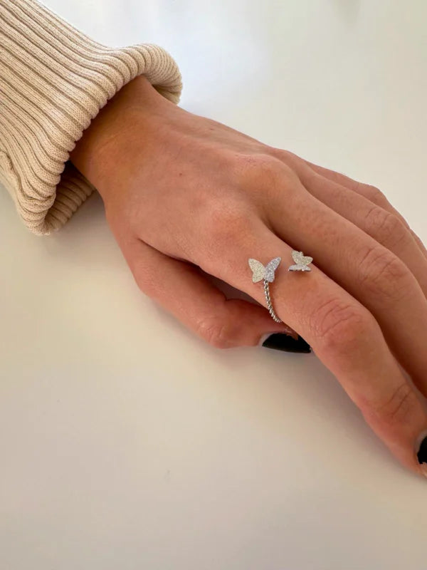 Anel ajustável em aço inoxidável torcido com duas borboletas, uma em cada extremidade do anel. As borboletas medem 1cm e 0,7cm.