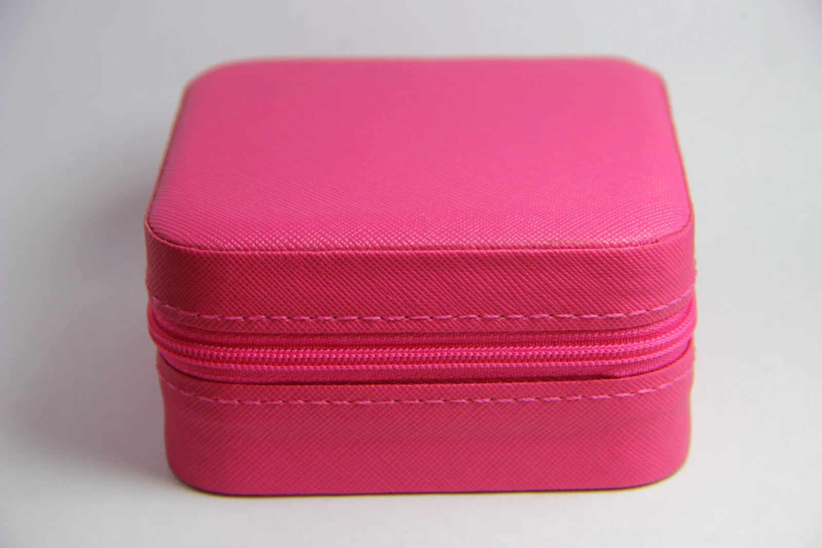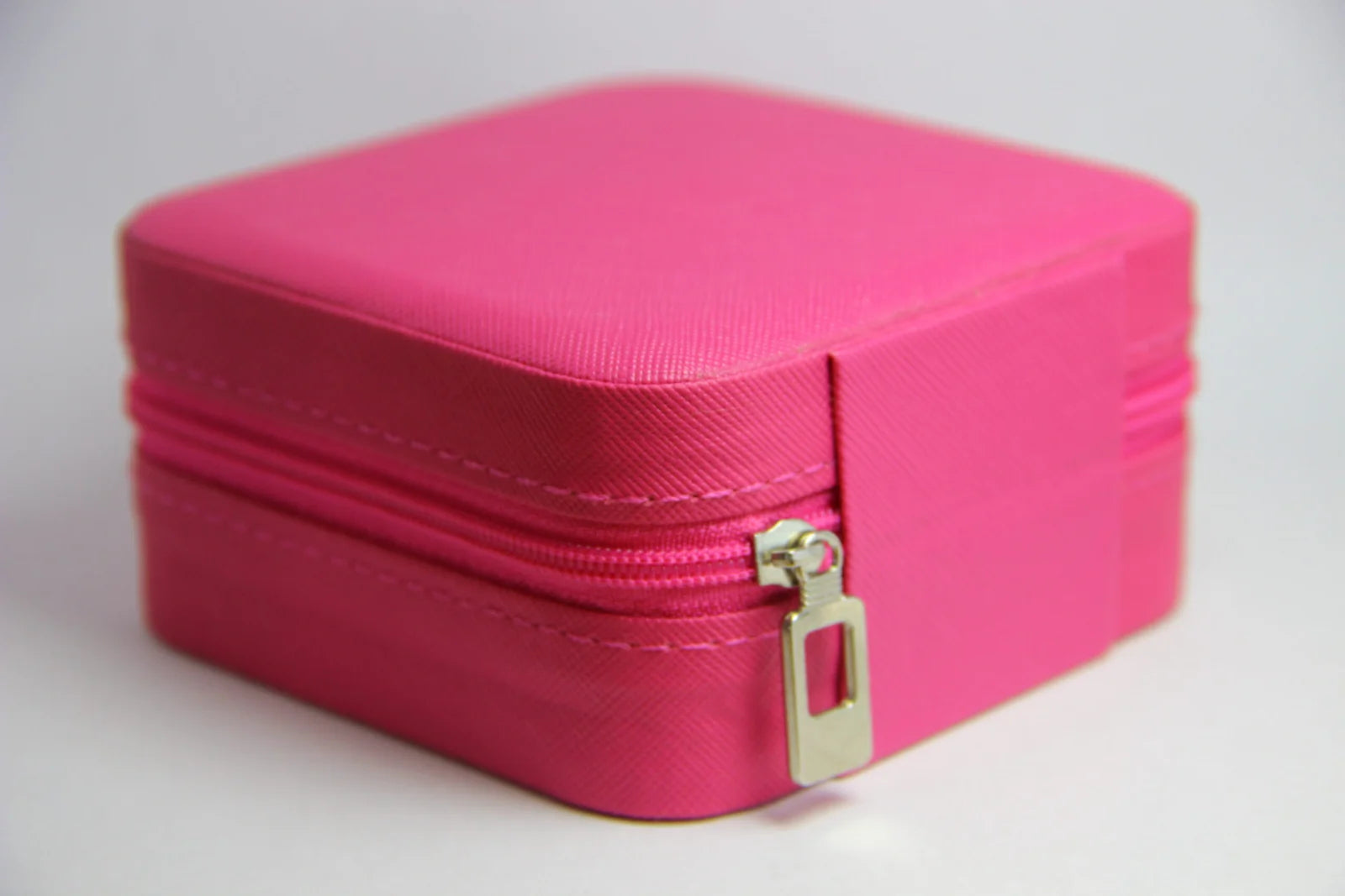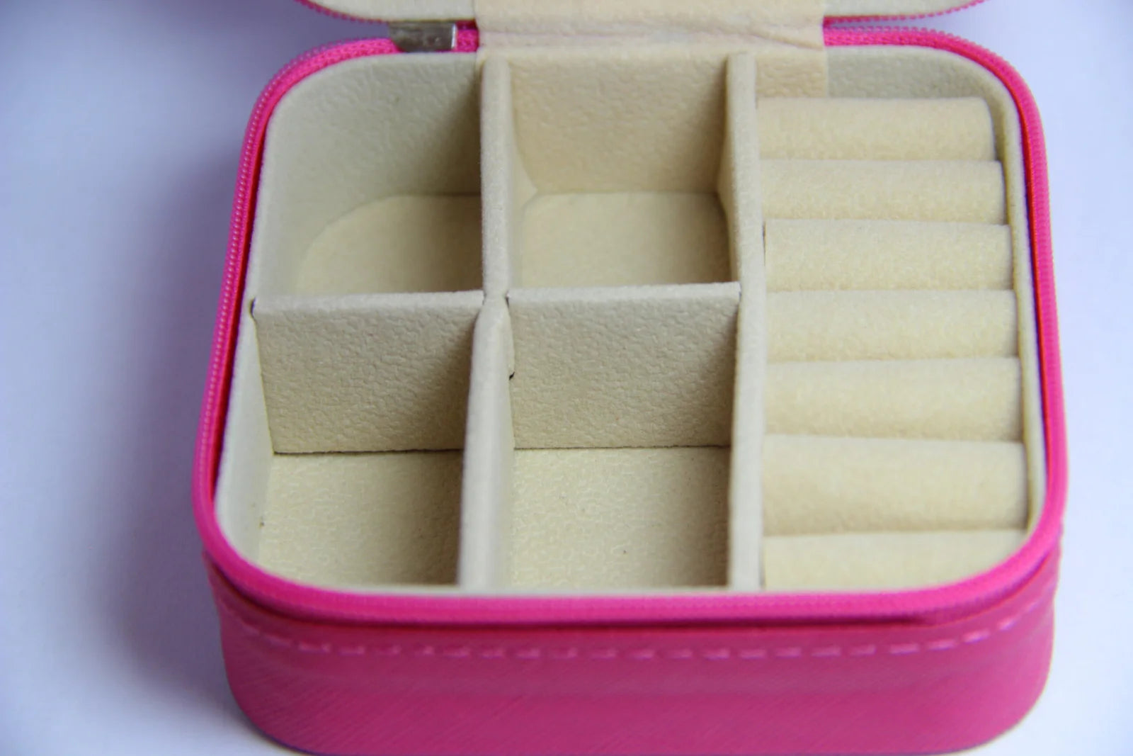 Mini guarda jóias, em tons de cor-de-rosa, com compartimentos para guardar os seus anéis, brincos, colares e pulseiras de forma organizada e sem que se misturem entre eles. Este mini guarda jóias é ideal para todas as viagens que ambicionas fazer, para que leves sempre contigo os teus acessórios favoritos.