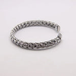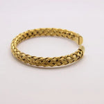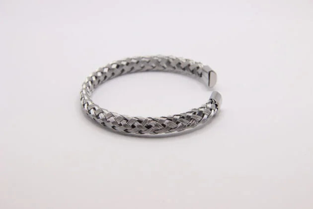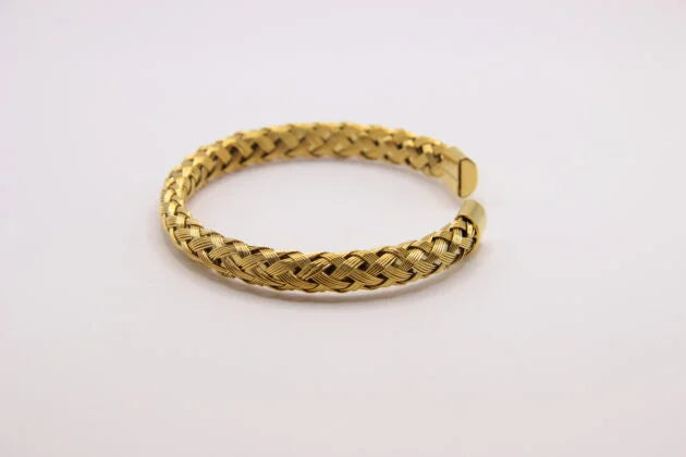 Pulseira rija em aço inoxidável, disponível em dourado e prateado, com um elegante efeito entrelaçado que adiciona sofisticação e modernidade à peça. É versátil e perfeita para qualquer estilo. Resistente e de alta qualidade, esta pulseira é a escolha ideal para quem procura um acessório que equilibre beleza e durabilidade.